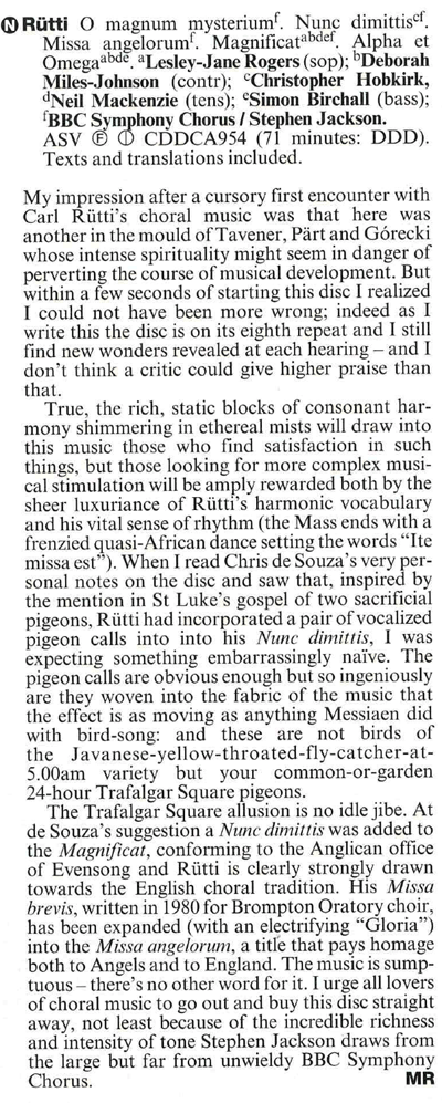 Gewiss, die reichen, stehenden Klänge von tonaler Harmonie, welche in himmlischen Nebeln schimmern, werden jene in diese Musik hineinziehen, welche in solchen Dingen Befriedigung finden, aber die, welche komplexere musikalische Anregung suchen, werden reich belohnt werden sowohl durch den reinen Überfluss an Rütti’s harmonischem Vokabular als auch durch seinen vitalen Sinn für Rhythmus (die Messe endet mit einem rasenden quasi afrikanischen Tanz über die Worte "Ite missa est"). Als ich Chris de Souza’s sehr persönliche Erklärungen über die CD las und sah, dass Rütti - inspiriert durch die Erwähnung von zwei Opfertauben im Lukas-Evangelium - die Rufe eines Taubenpaars in seinem Nunc dimittis vertont hatte, erwartete ich etwas mühsam Naives. Die Taubenrufe sind genug offensichtlich, aber so genial in den Stoff der Musik verwoben, dass die Wirkung genauso bewegend ist wie alles, was Messiaen mit Vogel-Gesang tat: und dies sind nicht Vögel der Javanischen - gelbhalsigen - Fliegenfänger - 5 Uhr früh - Sorte, sondern eure Feld-oder-Garten 24-Stunden Trafalgar Square Tauben.
